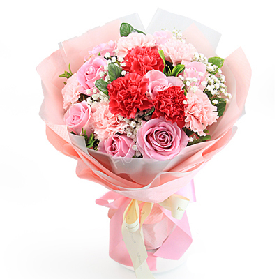 粉玫*8朵丶红色康乃馨*3朵丶粉色康乃馨*5朵丶绿色叶材丶满天星