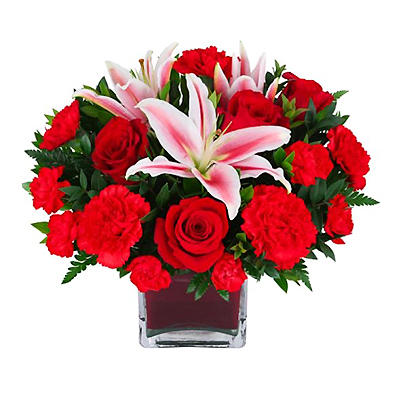 红色康乃馨, 红色玫瑰, 粉色百合, 季节叶材