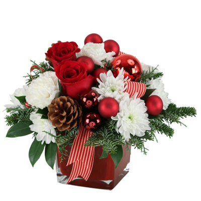 红玫瑰、白色康乃馨、白色雏菊、冬青、雪松、高贵冷杉