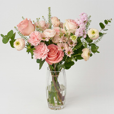 以粉色玫瑰为主,搭配粉色康乃馨、洋牡丹、紫罗兰、小菊及尤加利叶等花材,整体呈现柔和优雅的粉色花束。